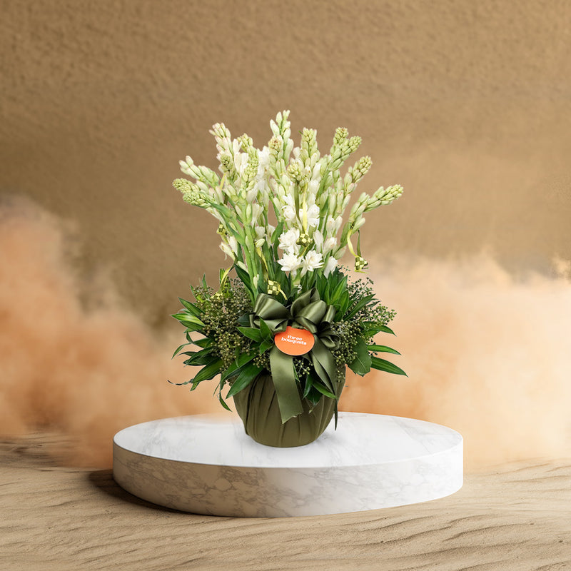 Rangkaian bunga putih yang anggun berpadu dengan dedaunan hijau yang segar, disusun dalam pot bernuansa olive yang refined dan modern. Sentuhan pita hijau elegan memperkuat kesan sophisticated sekaligus natural, menjadikan Sakina pilihan sempurna untuk memperindah ruang silaturahmi saat Lebaran.