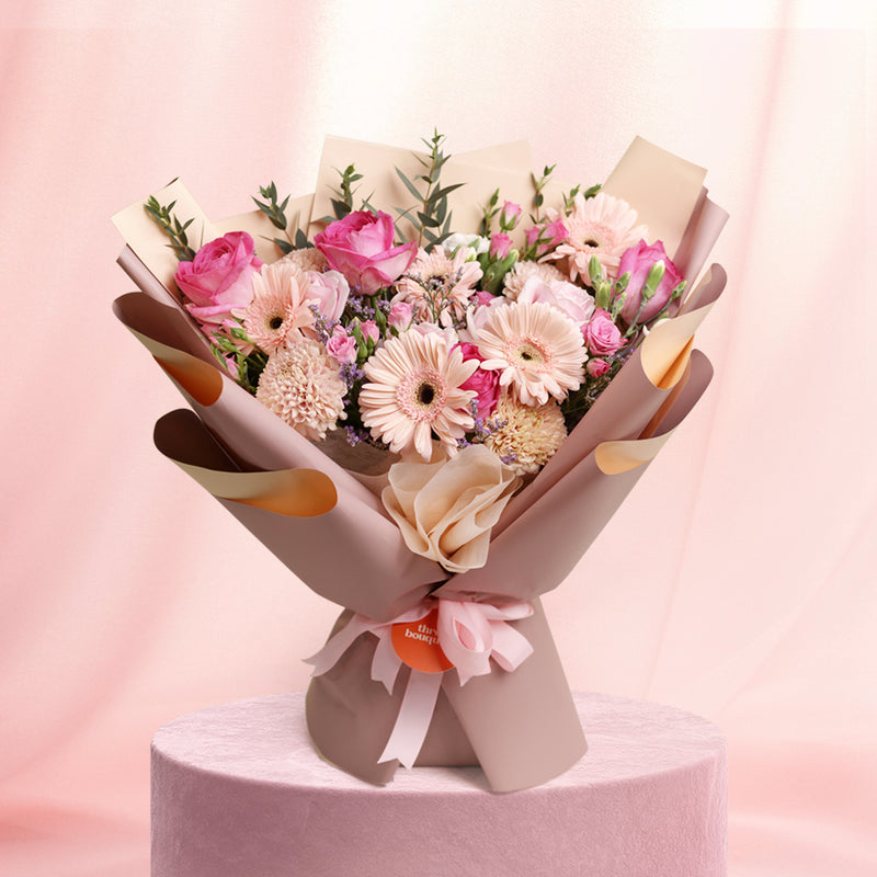 Bunga gerbera pink memiliki arti kekaguman atau simpati, sedangkan mawar pink melambangkan cinta dan rasa percaya diri. Cantiknya rangkaian ini sangat cocok untuk momen romantis kamu dan orang tersayang.